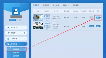 在左侧菜单栏选择“学习课程”,点击“继续教育”页签查看本账号的继续教育课程。用户可在继续教育课程列表右侧,点击“学习”按钮进入视频播放页面。