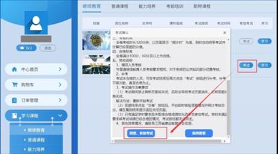 用户完成在线课程学习,取得本课程全部学时后,课程的“考试”按钮高亮显示,允许用户进行在线测试。