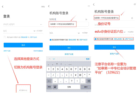 进入“登录”页面,选择“其他登陆方式”,输入如皋第一中专社会培训管理平台(或输入数字329622,选择如皋第一中专社会培训管理平台),进入登录页。