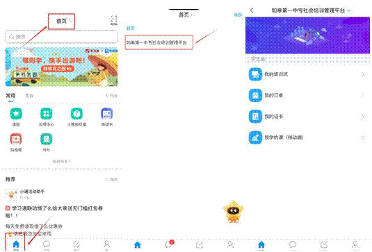 登录移动端后点击最下方【首页】,然后在页面最上方切换进入“如皋第一中专社会培训管理平台”页面,打开移动端学生空间,同网页浏览器个人空间,可查看“我的培训班”