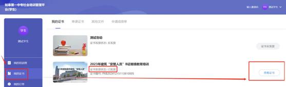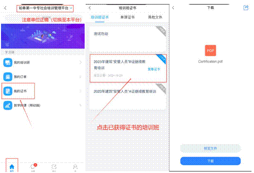 考试合格后,在平台首页【我的证书】中,可查看已获得的班级证书,点击可下载到手机。可能会出现一定延迟,请清除浏览器缓存重新打开,或进入【成绩】查看成绩是否同步。