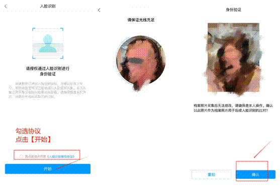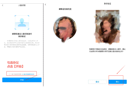 扫码后自动跳转人脸采集页。首次进入人脸识别的采集结果将会作为后续人脸识别的比对,请确保是本人且照片是正脸、睁眼、清晰的状态。