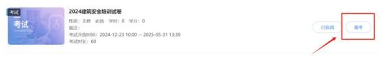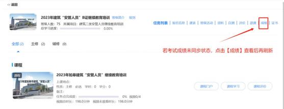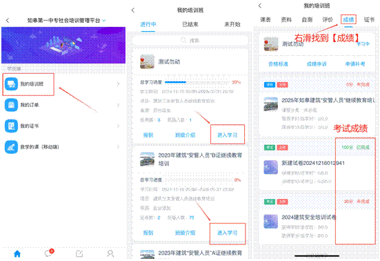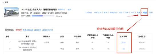 考试结束后,在【我的培训班】找到【成绩】,查看考试是否合格。否则重考。