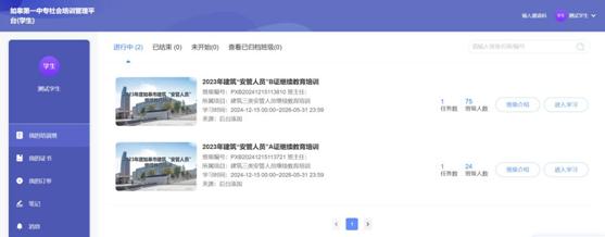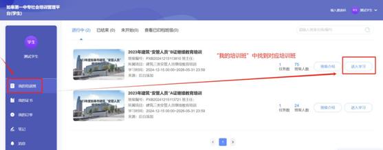 进入个人学习空间,点击“我的培训班”可查看本人所属培训班。点击进入学习。
