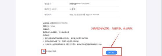 进入考试须知阅读页,请仔细阅读并确认考试时长、时间、规则等,勾选同意。