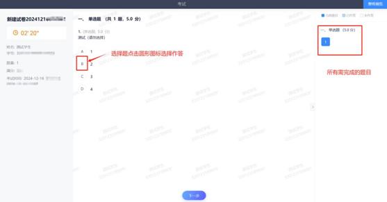 正式进入考试后,可对每一题作答,考试题型可能会有单选题、多选题、判断题、填空题、主观问答题等(根据课程不同)。右侧可查看考试剩余时间,左侧可查看所有需完成的题目。完成作答后点击【下一步】进入下一题。