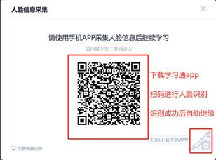 再次进入课程或课程学习中会跳出人脸图像采集通知,此时系统中已有学员照片作为识别依据,故可使用学习通app扫码进行确认。识别为本人即可继续学习。