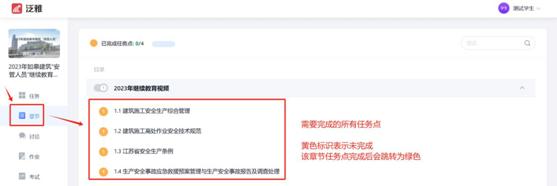 为绿色。若任务点还未完成,圆点中会显示待完成任务点数。点击章节进行学习。