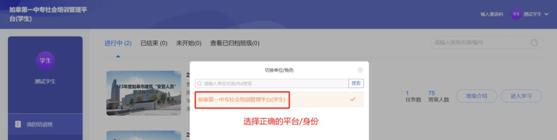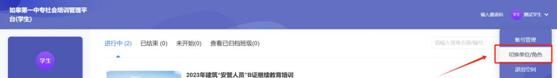点击右上角头像,下拉框选择【切换单位/角色】,找到“如皋第一中专社会培训管理平台(学生)”进行切换。